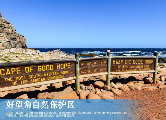 【好望角】于開普半島南端,在保護(hù)區(qū)內(nèi),鐵銹色凹凸不平的地面上生長著一片片低矮的灌木叢和被稱為南非國花的山龍眼,狒狒、非洲旋角大羚羊等動物間或在眼前一躍而過。在大西洋邊紅色的卵石灘上,時常可見駝鳥閑庭信步的可愛模樣。在保護(hù)區(qū)的西南端有一個如同伸入大西洋中巨大鱷魚爪的岬角。