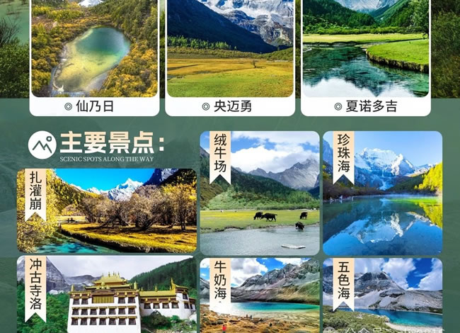 早上:7:00 早餐后乘車經(jīng)波瓦山到達【亞丁景區(qū)】(門票已含,首次觀光車 120/人自理,必須消費),后在游客接待中心換乘景區(qū)觀光車抵達亞丁景區(qū)【扎灌崩】(40 公里,車程 1.5 小時),下車后游 客徒步上山直接抵達沖古寺。 中午:景區(qū)中餐自理,觀賞沖古寺風(fēng)光及神山仙乃日風(fēng)光,然后可自費乘坐電瓶車(自理往返 70/人,單程 40/人)前往【洛絨牛場】(如徒步需 1-2 小時左右達到洛絨牛場)。這里是觀【夏諾多吉神山】(意為金剛手菩薩,海拔 5958 米)【央邁勇神山】(意為金文殊菩薩,海拔 5958 米)的最佳地點,讓神山圣水與心共鳴,盡情沉醉在夢幻之地,后原路返回,到達【扎罐崩】乘觀光車返回住宿地。 晚上:回到日瓦鎮(zhèn)或稻城,晚餐后入住酒店。溫馨提示:因當(dāng)天游客出景區(qū)時間不統(tǒng)一,所以旅游車無法統(tǒng)一接送游客,游客可以選擇乘坐當(dāng)?shù)毓卉嚕?-10元/人自理)。亞丁景區(qū)分長線—牛奶海、五色海和短線—珍珠海游覽。長線游覽:因牛奶海和五色海海拔高,客人務(wù)必根據(jù)自身實際情況選擇是否前往(可選擇自費騎馬305元/人至舍身崖約1.5小時,再徒步至牛奶海和五色海需約1.5小時,冬季11中旬至次年3約中旬馬幫停運,需徒步單程5KM往返10KM,徒步往返時間約4.5小時)到達【牛奶?!?,再徒步前往【五色?!浚ㄍ讲郊s20分鐘);【牛奶?!亢0?800米,又叫洛絨措,古冰川湖,狀如水滴,四周雪山環(huán)繞,湖水清瑩碧藍,山止成瀑,以其玲瓏秀雅水色翠藍而著名。牛奶海在央邁勇的山坳里,呈扇貝形,中間是碧藍的雪水,周邊則是一圈乳白色環(huán)繞,這圈乳白色大致就是牛奶海名稱的由來。牛奶海是美麗的,遠遠望去,仿佛碧玉鑲嵌在雪山之中,純凈安詳。純凈的湖水給人以平和安寧的心境,而藍湛湛的海子并不透明,顯得神秘莫測。傳說能治聾啞病的圣湖?!疚迳!亢0?600米,由于光的折射下,產(chǎn)生五種不同顏色而得名:其真名為“登崇措”。五色海它位于仙乃日與央邁勇之間,湖面呈圓形。面積0.7公頃,現(xiàn)代冰谷下伸至湖畔,雪山倒影湖面,呈現(xiàn)奇幻的色彩。是藏區(qū)著名的圣湖(佛經(jīng)中贊譽該湖與西藏羊巴雍措齊名),據(jù)傳能“返演歷史,預(yù)測未來”。短線游覽:游客可乘坐景區(qū)觀光車抵達扎灌崩,徒步500米到達沖古寺,前往仙乃日神山下的圣湖【珍珠?!慷叹€游覽(單程約1.5KM,徒步前往約40分鐘),海拔3950米。【珍珠?!吭诓卣Z中稱為“卓瑪拉措”,是仙乃日的融雪形成的海子。面積約0.1平方公里。密林中的珍珠海如一顆鑲嵌在蓮花寶座上的綠寶石,碧波蕩漾,粼粼波光中透出無限清麗,湖畔四周,參翠如屏。春天湖邊片片杜鵑花燦爛怒放,秋天層林盡染,倒影著五彩斑斕的世界,令人目眩神迷?!緛喍【皡^(qū)】以仙乃日、央邁勇、夏諾多吉三座雪峰為核心區(qū),北南向分布,三座雪山呈品字形,三峰藏名為“念青貢嘎日松貢布”,意為“三怙主雪山”,是眾生朝圣積德之所在地。由于特殊的地理環(huán)境和自然氣候,形成了獨特的地貌和自然景觀,是中國保存最完整的一處自然生態(tài)系統(tǒng)。
